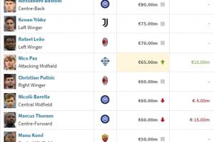 德轉(zhuǎn)意甲身價(jià)更新:勞塔羅最高8500萬(wàn)歐不變,帕斯?jié)q至6500萬(wàn)歐