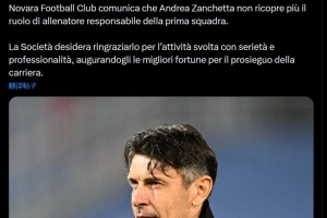 體育資訊12月23日訊 意丙球隊(duì)諾瓦拉宣布,前國米青年隊(duì)教練贊切塔下課。