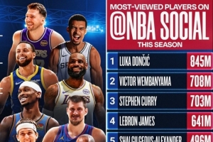 本季社媒觀看次數(shù)Top10:東契奇8.45億居首壓文班 庫詹三四KD第八