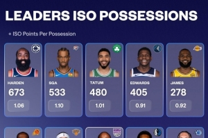 其中哈登單打回合數(shù)673次斷檔領先,亞歷山大533次排在第二,第三的則是塔圖姆480次。單打回合數(shù)4-10名的球員分別是:愛德華茲、詹姆斯、杜蘭特、布倫森、德羅贊、歐文、班凱羅。(注:單打回合數(shù)、單打每回合平均得分如圖)