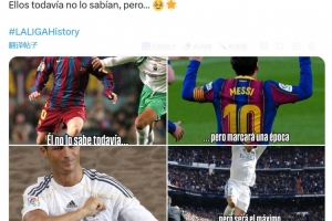 西甲官方曬出梅西的對比照,同時配文:“他還不知道,但他會在巴薩創(chuàng)造歷史”,而對于C羅的對比照,西甲官方配文:“他還不知道,但他會成為皇馬歷史最佳射手”。