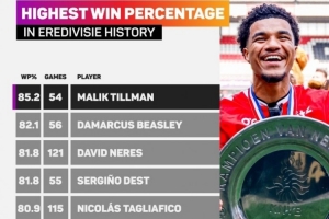 據(jù)統(tǒng)計,蒂爾曼是荷甲歷史上勝率最高的球員(出場至少50次),他在荷甲勝率為85.2%(46勝4平4負(fù))。