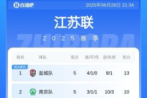 體育資訊06月28日訊 蘇超第五輪今日結(jié)束兩場比賽,連云港2-0戰(zhàn)勝淮安,終結(jié)3輪不勝。鹽城2-0戰(zhàn)勝鎮(zhèn)江,收獲3連勝。最新積分榜如圖。