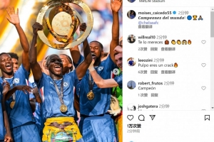 凱塞多社媒曬出舉起獎杯的照片,慶祝球隊奪冠,配文:“世界冠軍!”