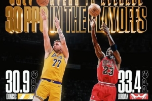 喬丹生涯179場(chǎng)季后賽,場(chǎng)均33.4分;東契奇55場(chǎng)季后賽,場(chǎng)均30.9分。