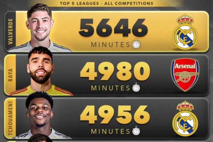 體育資訊07月16日訊 隨著世俱杯的結(jié)束,2024/25賽季也劃上了句號。外媒score90統(tǒng)計了本賽季五大聯(lián)賽球員在俱樂部的出場時間,巴爾韋德以5646分鐘斷層排名第一,第二是阿森納門將拉亞。