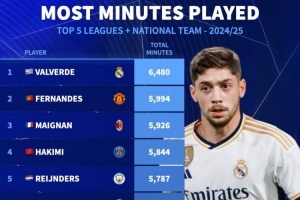 體育資訊7月17日訊 德國轉會市場統(tǒng)計了五大聯(lián)賽球員上賽季俱樂部+國家隊的出場時間,并列出榜單,巴爾韋德居首,B費、邁尼昂二三位。