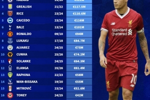 體育資訊7月18日訊 德轉(zhuǎn)盤點(diǎn)了英超目前20支球隊(duì)隊(duì)史賣人最貴榜單,其中庫蒂尼奧、阿扎爾等球員在列,具體如下: