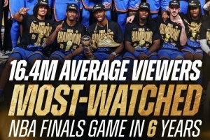 體育資訊6月24日訊 昨天,雷霆搶七103-91戰(zhàn)勝步行者,成功奪冠。據(jù)NBA官方統(tǒng)計(jì),這場(chǎng)比賽是近6年來(lái),收視率最高的總決賽。