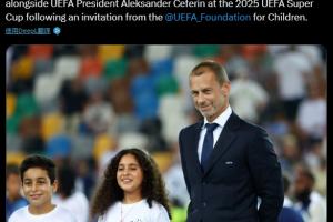 本場比賽,兩名巴勒斯坦難民兒童,受到歐足聯(lián)兒童基金會邀請,與歐足聯(lián)主席切費林一起參加賽后的頒獎儀式。