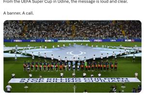 歐足聯(lián)官方在社交平臺(tái)上配文寫道:“來(lái)自烏迪內(nèi)的歐洲超級(jí)杯現(xiàn)場(chǎng),這則信息響亮且清晰,一面標(biāo)語(yǔ),一次號(hào)召?!边@一標(biāo)語(yǔ)并沒(méi)有明確針對(duì)的對(duì)象,但歐足聯(lián)在活動(dòng)期間還邀請(qǐng)了兩名來(lái)自巴勒斯坦的難民兒童參加頒獎(jiǎng)儀式,指向性十分明確。
