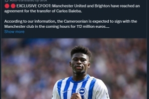 喀麥隆媒體CFOOT報(bào)道稱,曼聯(lián)已經(jīng)與布萊頓就巴萊巴轉(zhuǎn)會(huì)達(dá)成協(xié)議,球員預(yù)計(jì)將在未來(lái)幾個(gè)小時(shí)與曼聯(lián)簽約,費(fèi)用1.12億歐元。